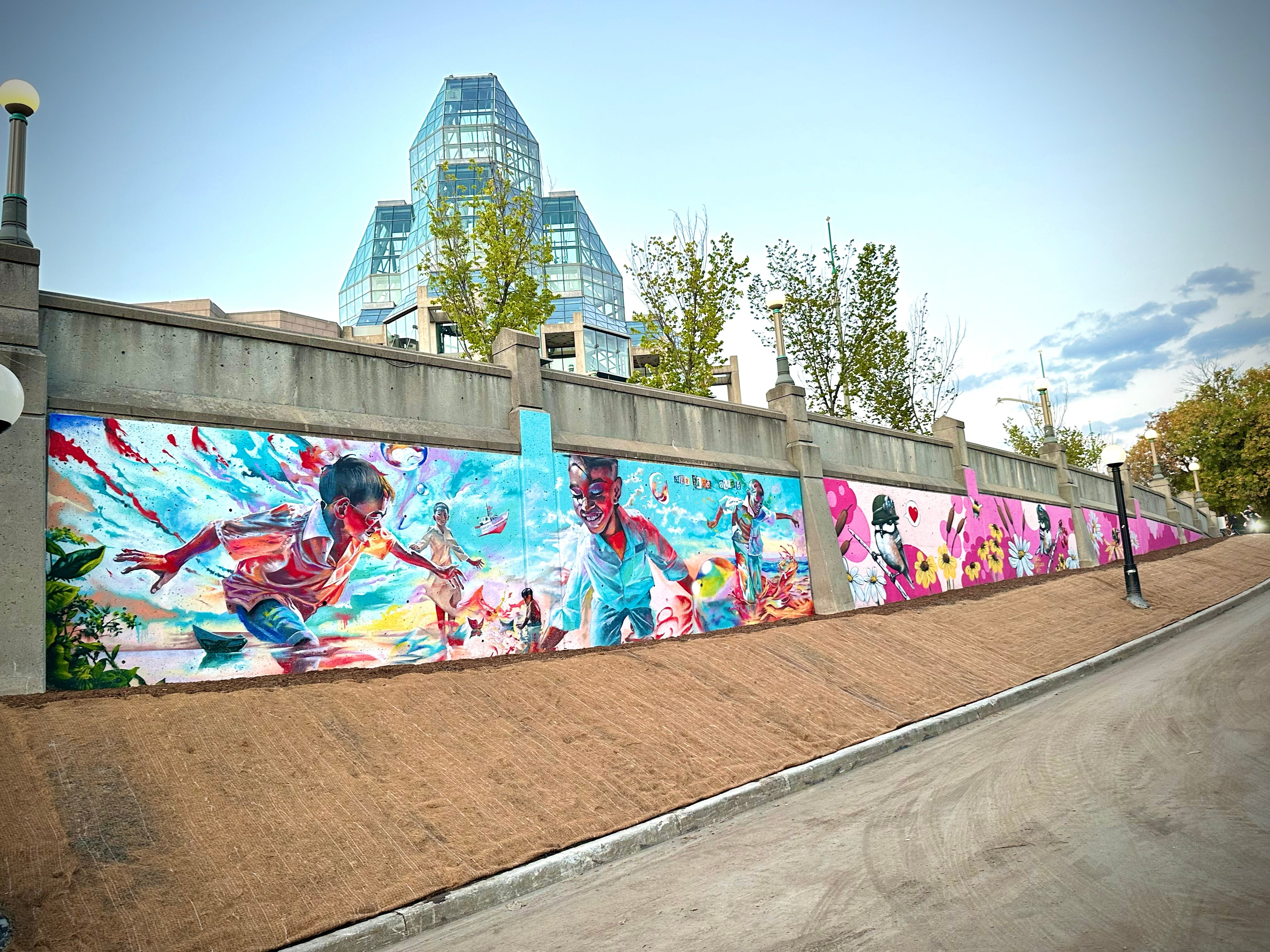For this year’s festival we partnered with the National Capital Commission to Paint a Stunning 400 ft Wall. The Artwork serves as a Centerpiece for our City, Showcasing the Vibrant Talents of Local and Nationally Recognized Artists.